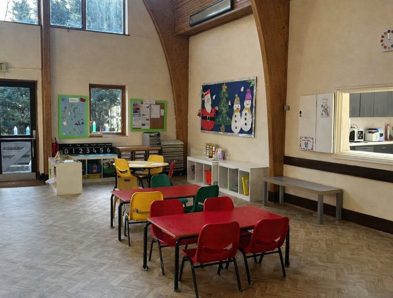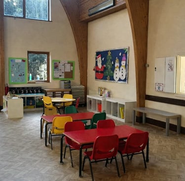 Our bright church hall includes a kitchen, toilets, an enclosed garden, and secure fencing.